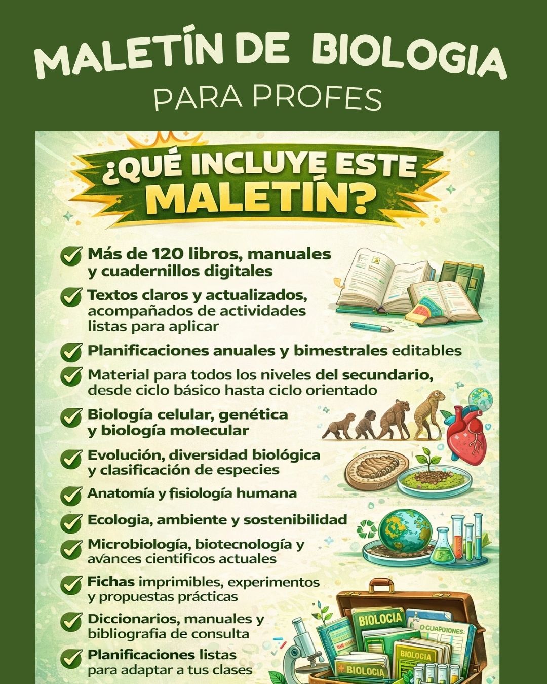 Este maletín digital reúne material teórico, práctico y pedagógico para trabajar todos los contenidos de Biología en secundaria. Ideal para enriquecer tus clases, planificar proyectos, preparar evaluaciones o contar con una biblioteca digital completa que te acompañe todo el año.