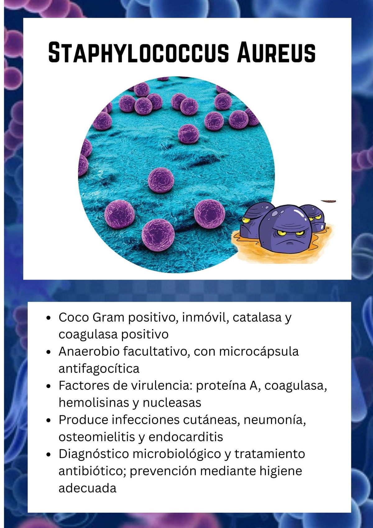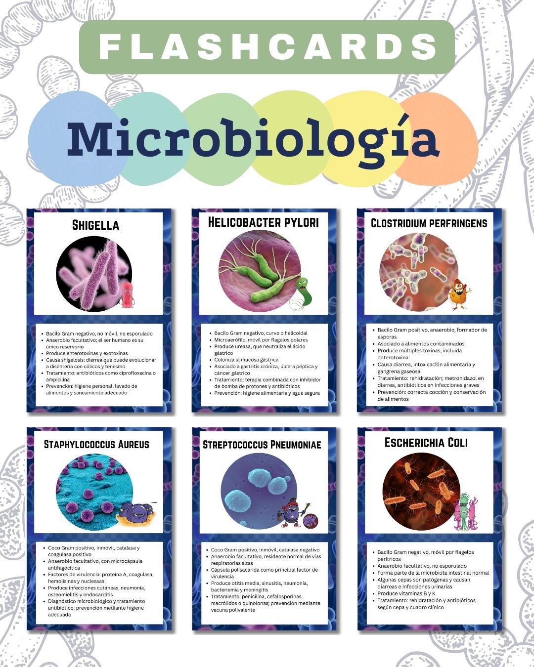 Este set de 36 flashcards de Microbiología reúne los principales microorganismos de interés clínico, presentados de forma clara, sintética y visual. Cada tarjeta combina características microbiológicas, factores de virulencia, enfermedades asociadas, tratamiento y prevención, facilitando el estudio activo y la memorización comprensiva.
