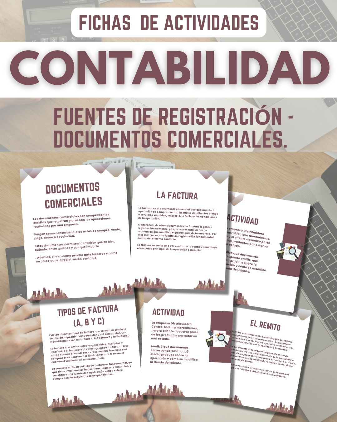 El set reúne fichas didácticas con textos teóricos breves y actividades basadas en situaciones ficticias, pensadas para que los estudiantes analicen, relacionen y comprendan el uso real de cada documento dentro del ciclo operativo de una empresa.
