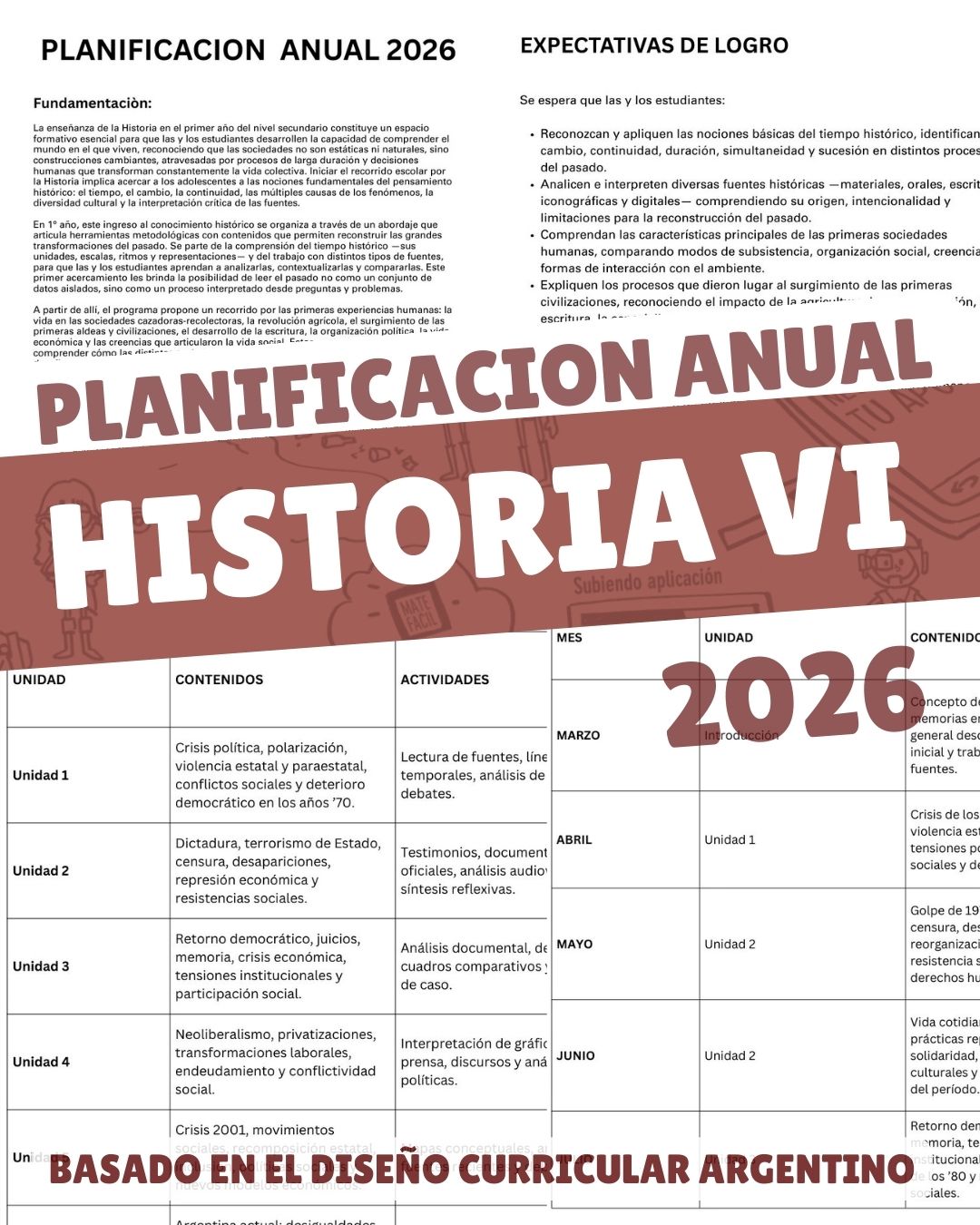 La Planificación Anual de Historia VI 2026 es un material riguroso, actualizado y pensado específicamente para trabajar el período de Historia Reciente Argentina, desde los años ’70 hasta la actualidad.