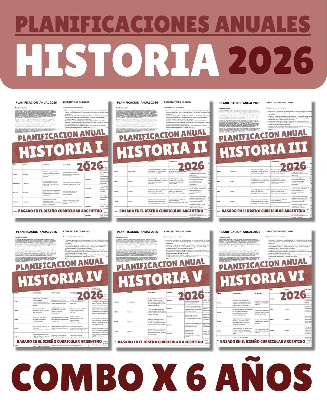 El Combo Completo de Planificaciones Anuales de Historia 2026 reúne las seis planificaciones oficiales del espacio de Historia para toda la secundaria, desde 1° hasta 6° año.
