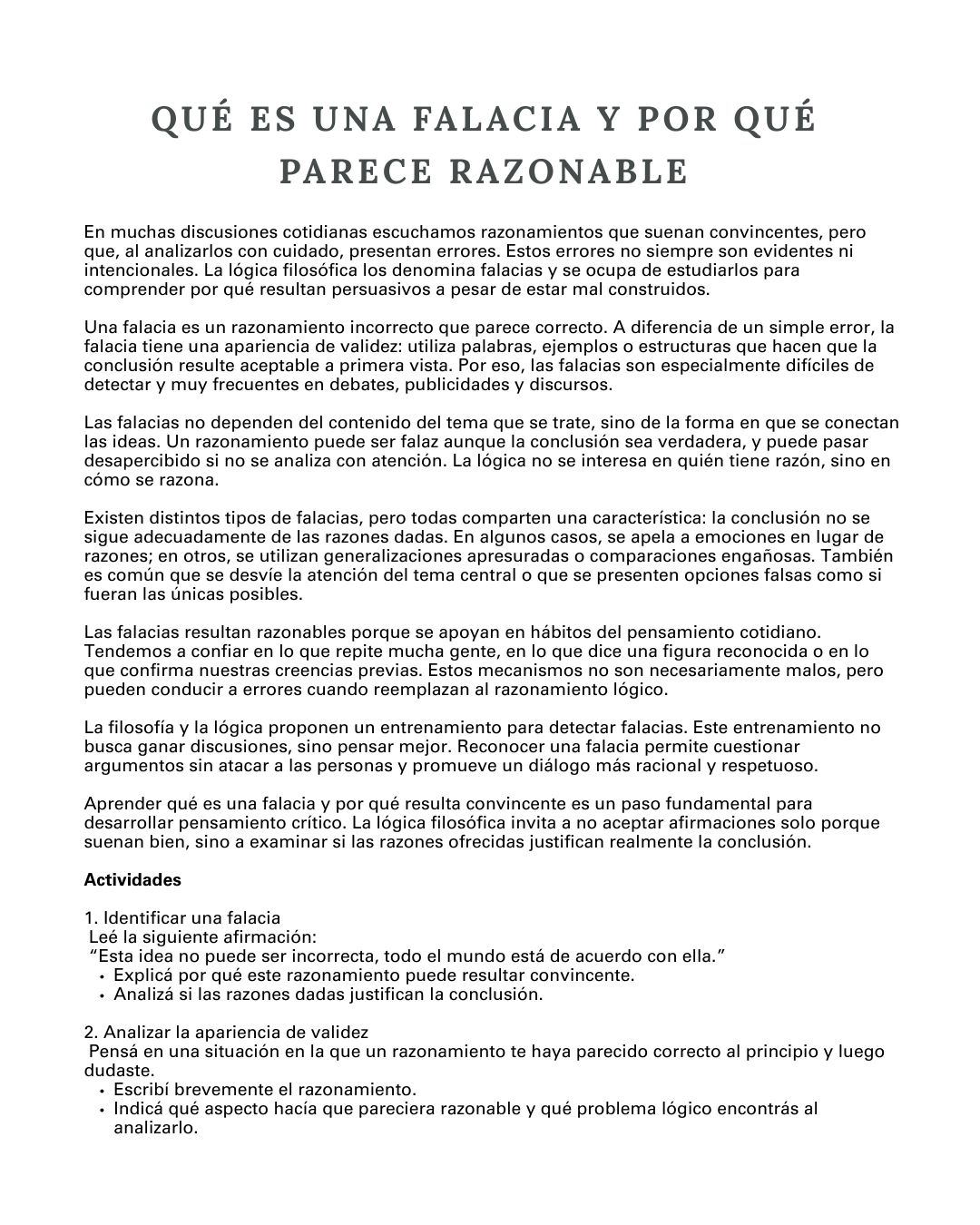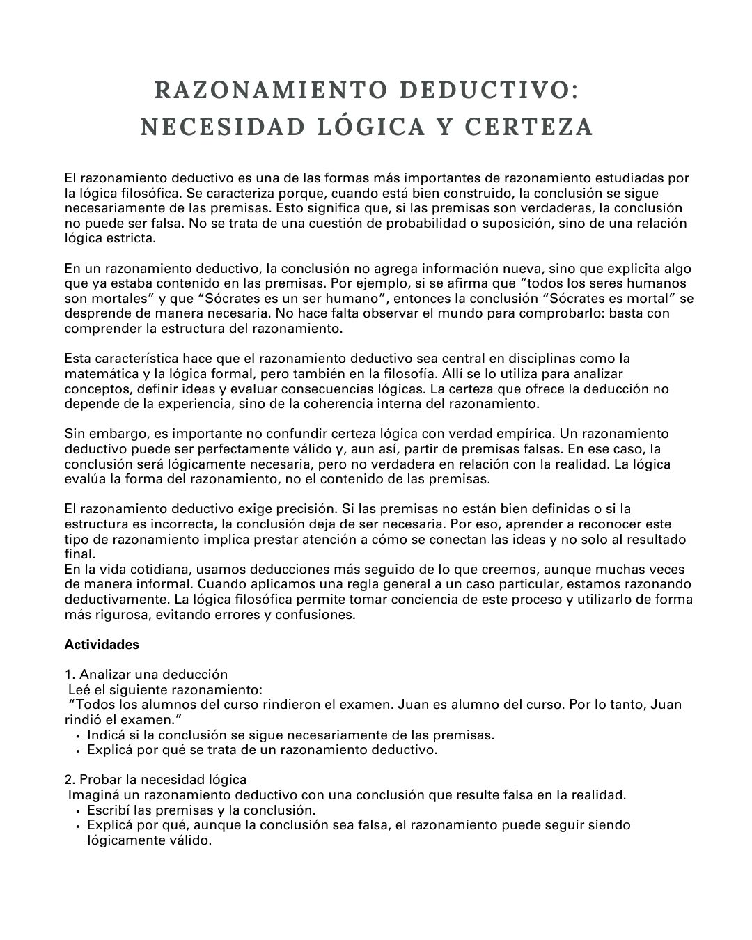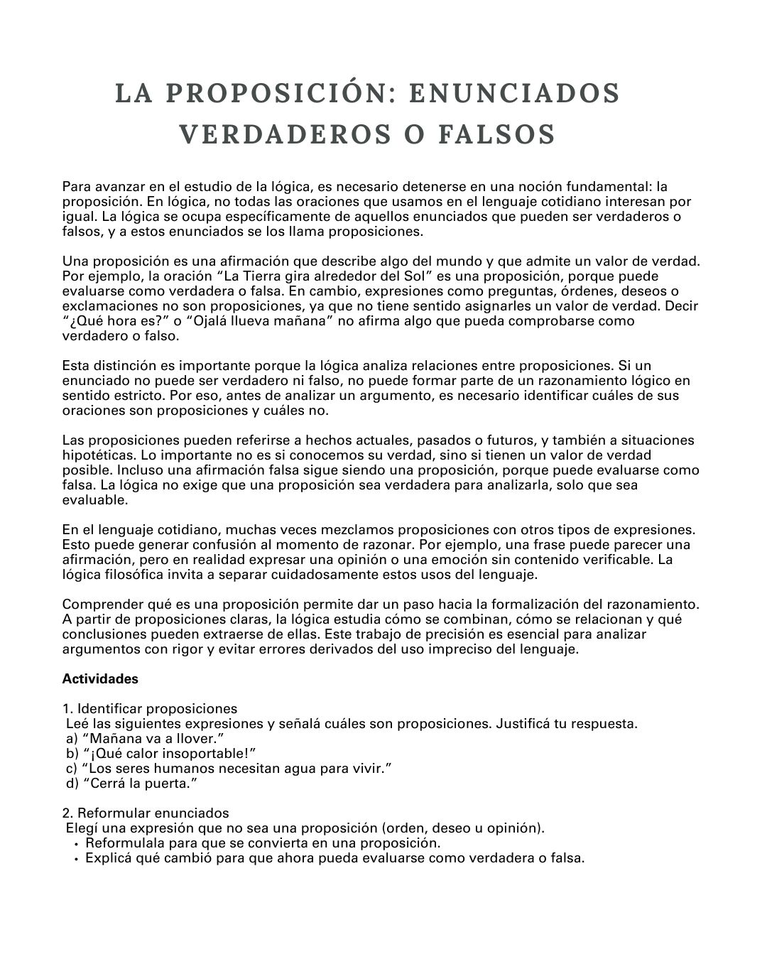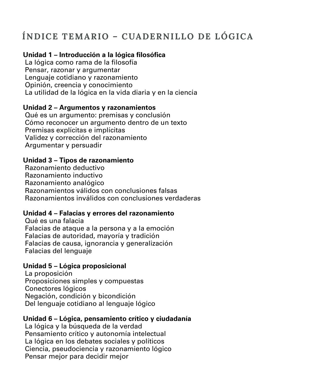 El material propone un recorrido claro y progresivo por los principales contenidos de la lógica filosófica, combinando textos explicativos accesibles con actividades de análisis, reflexión y ejercitación lógica, pensadas para estudiantes de nivel secundario.